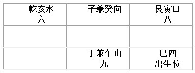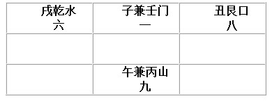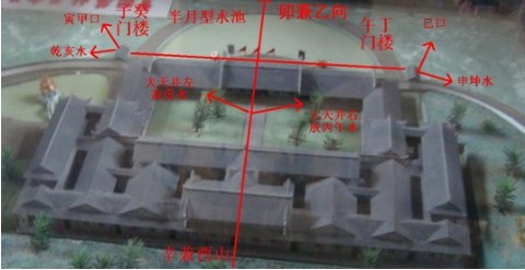 大门:坐丁午山,左亥乾水(收水线乾亥),左艮寅口,出生巳位,左天井放亥水右天井放艮丑水。