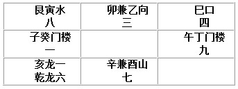 正大门:坐辛兼酉山,右午丁门,左癸子门,卯甲峰,走巳口。
