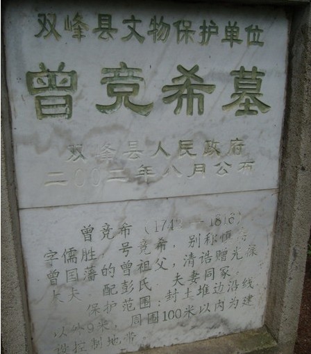 在娄底双峰县,流传着曾国藩家族之所以发家,全靠着他的曾祖竞希公金鸡啄白米坟地的风水。该坟三面群山环抱,山脚皆有良田围住金鸡,金鸡两边有屈曲之流水环抱,于前面合二为一直出,曾竞希的坟葬在鸡脖上。坟后面是一狭长的山地,似鸡身。狭长的山地的背后,后面突起,像鸡尾;长圆形山丘的两边,有两片扇形山地,恰如鸡翅。鸡尾的顿落,使金鸡飞落山谷逐米之形势更加逼真,前有远近呼应的山丘和良田,青龙砂回头作案,乾龙出脉,辛酉过脉,立酉山卯向兼辛乙吉度分金,辛龙辛命正是此地荫生,前方案后卯峰突起,为卯向卯水卯口卯峰,合杨公八连珠之上理。鸡头前面是一条叫犁头咀的小河。河边有一片良田,据传,在曾竞希葬后第二年的春天,连下三天大雨,山洪暴发,金鸡前面的禾苗全被冲走,剩下一片白茫茫的沙子地,恰似白米。风水师告诉曾家说,这是曾竞希金鸡啄白米坟地的显灵,曾家必将大富大贵,但必须保护好这片宝地。于是,曾家就买下了这块沙洲并不再耕种。这便是金鸡啄白米的由来,祖坟少祖金星体态端正,中抽一脉,在两边养龙池夹送之下,龙身带曜,袅袅向前作蛇状逶迤前行,故曾国藩又称蟒蛇投胎,蛇形属水星,水星在泡,起顶冒泡结穴,结穴后又分开两支继续前行,形似杨柳枝条,又喝形为杨柳枝形,其阴宅落穴之处必是高人指点方有此杰作,墓碑上记载相当明白,刻着墓主人生於乾隆八年癸亥五月二十三日子时。桐梓坪生寝,没於嘉庆二十一年,乙亥十二月十八日未时,白洋坪新屋去世,塟本都鱼,沐西冲水桐仛,正作杨柳枝形,酉山卯向立坟。其妻彭氏同塟此穴,生於乾隆十年乙丑五月二十九日辰时,没於嘉庆八年。此间正作杨柳枝形,酉山卯向立坟。乃是建坟地师的寻龙点穴总结。经验证形气龙水格局,正是偏枝杨柳出正心之格。足可见其坟点穴的地师深明杨公风水>峦头形气之变化,三元理气之奥妙,乃是明师择取而作。因为;金鸡啄白米坟地有灵,所以他们的后代文运、官运发达。曾竞希的孙子麟书,即曾国藩的父亲,在43岁的时候,参加了第17次小考之后,破天荒成为大界曾氏数百年来的第一个秀才。从此以后,人文蔚起,50年时间内,先后产生了曾国藩、曾广钧两进士,举人、优贡、秀才更是多达数十余人,此前从无文风,皆为白丁,可见风水之奇妙。