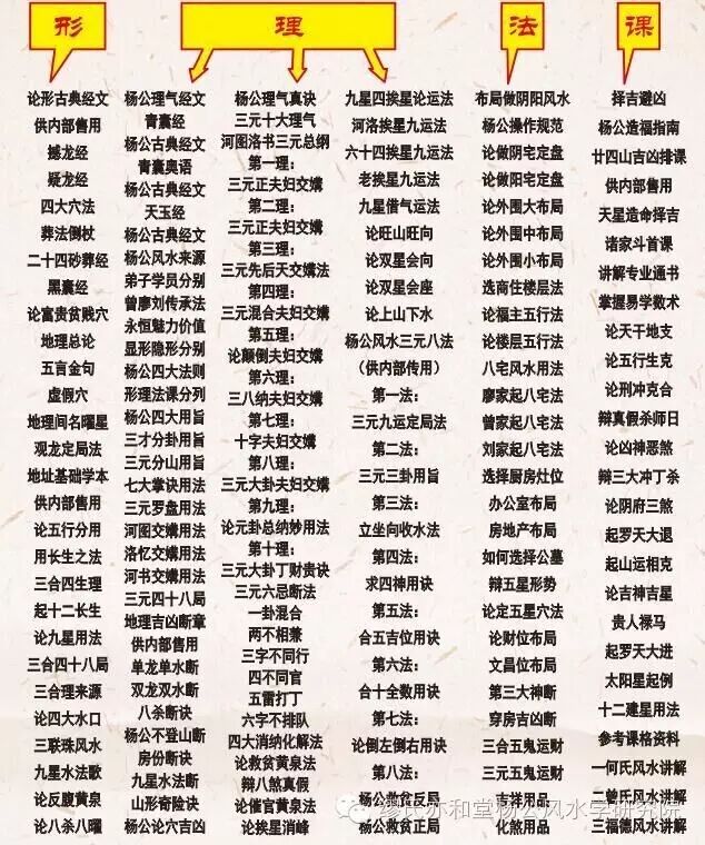 (5)要认真学习杨公最为正统的三元地理真实的消山纳水法,必须掌握三元的罗盘应用法,三元理气用法规则,三元头十大理,六大忌,四大化解大法,杨公挨星借运法,六十四卦挨星配运法等三元地理各条大功夫,培训时发给学员上课用。